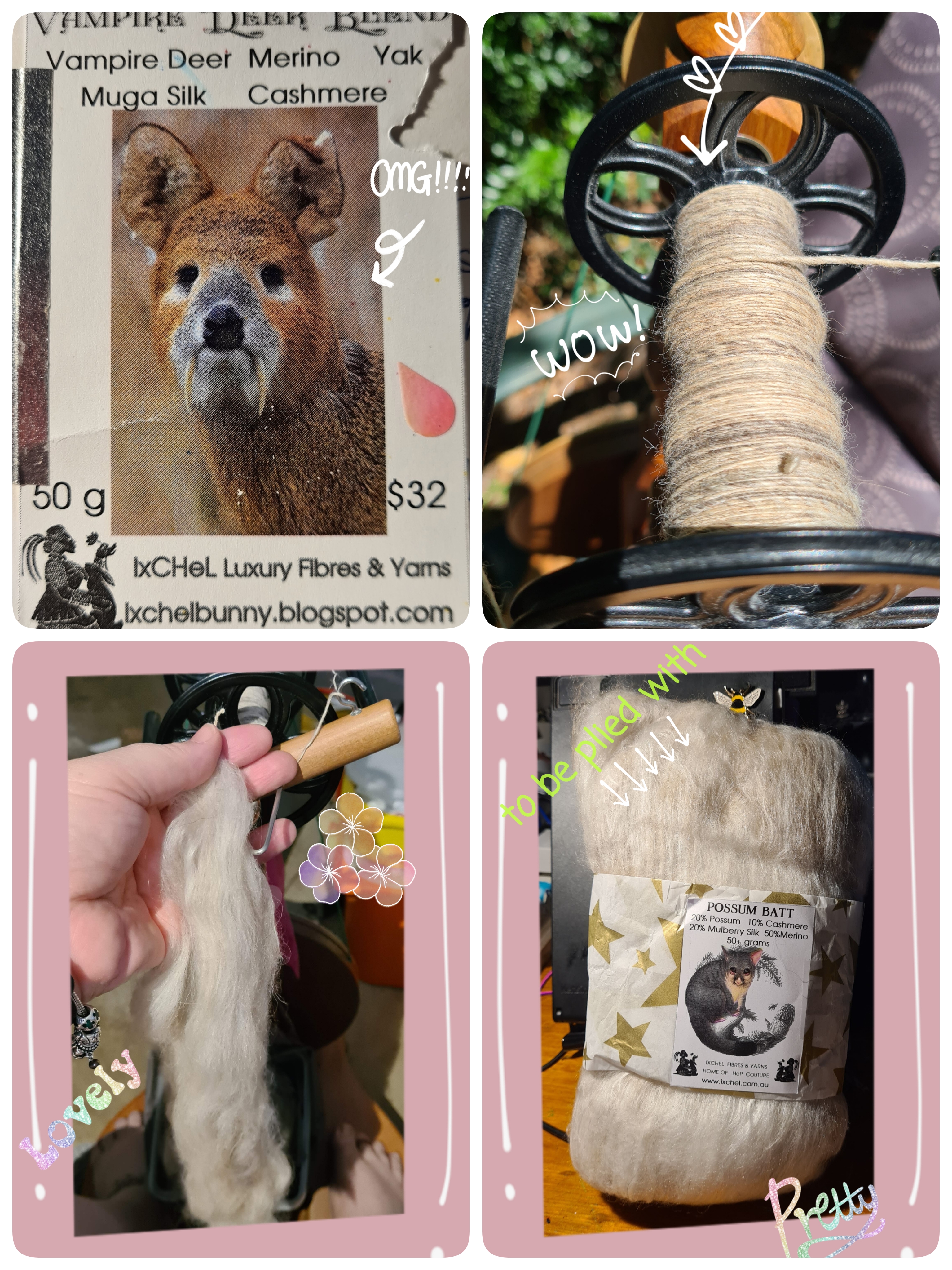 Vampire Deer, Merino, Yak, Muga Silk, Cashmere top & Possum/mulberry silk/cashmere/merino batt. Cream/white/touches of grey/reddish